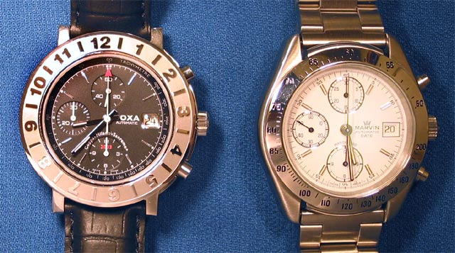 In comparison to the standard valjoux 7750 subdial layout, the Coppa registers are at the 9 o'clock and 12 o'clock position are switched. This can be seen in the above photo which compares the Coppa to a Marvin Matchless chronograph using the Valjoux 7750. The chronograph hand, accentuated by a red arrow on the tip, is activated by the top pusher and reset using the bottom. It has the smoothest sweep movement on any watch I have seen.